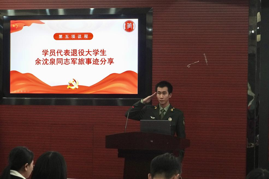 在此之后,学院代表退役大学生余沈泉同学分享军旅事迹时表示,忠诚担当、无私奉献的烙印早已深深刻在军人骨子里。当谈及山林扑火等经历时,余沈泉同学感慨,这些经历让他直观体会到人民子弟兵的殊荣,更清晰认识到生命的责任与价值。韶华若弦,初心如焰,他表示将以更高的标准严格要求自己,主动发挥党员先锋模范作用,带动身边同学共同进步,用实际行动践行铮铮誓言。