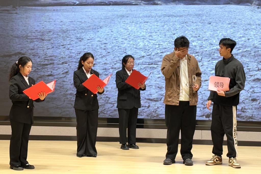 在表演结束后,马克思主义学院副教授李功清同志对选手表现进行总结点评。他充分肯定了各参赛队伍在舞台呈现上的用心,特别指出选手们站位准确、眼神交流到位、细节处理得当,使舞台剧充满正能量。李老师强调,比表现形式更重要的是作品所传递的红色文化内涵。他指出,红色血脉的传承,正在于以这样的故事激励青年一代。他勉励在场学生,应通过这四年的学习与沉淀,将红色精神转化为奉献青春的扎实行动,这正是举办“党群故事会”的初心所在。