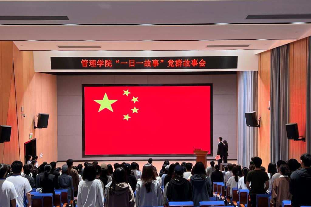 2025年12月2日晚,在三水校区第四综合楼七楼学术报告厅,管理学院“一日一故事”党群故事会讲述大赛决赛在庄严的奏唱国歌仪式中正式开始。学院师生代表整齐肃立,齐声高唱,以昂扬的姿态展现了浓厚的爱国情怀,为整场活动奠定了庄重而热烈的基调。