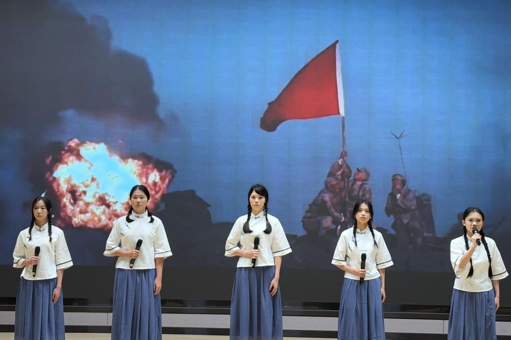 接下来管理学院团学合唱团深情演绎一首《我爱你中国》,以嘹亮歌声传递真挚爱国情怀。演出情感饱满,旋律动人,为现场增添了庄严而热烈的氛围,生动呼应了活动弘扬红色精神、砥砺奋斗初心的主题。