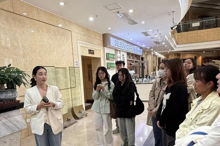 接着,戴经理带着师生参观了酒店各部门的工作场所,讲解了酒店行业在招聘、培训和用工管理方面的特殊性。
