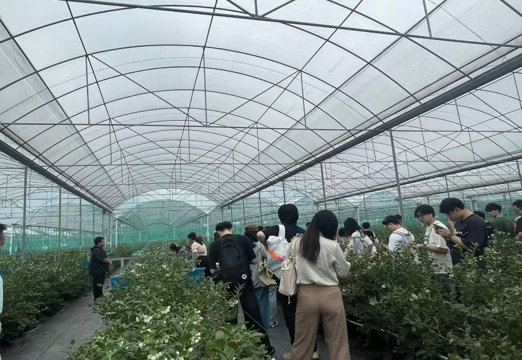 基地李工为师生们耐心细致地介绍了引进的以色列先进水肥灌溉系统,详细讲解了5G技术在蓝莓种植、管理、采摘及加工等方面的应用,还耐心地回答了各种疑问。师生们询问了蓝莓的生长周期、口感特点、销售价格等问题。虽然目前不是蓝莓的成熟期,未能亲身体验蓝莓的采摘过程,但师生们纷纷表示,通过此次参观,他们更加直观地了解了现代科技在农业生产中的应用,以及这些技术如何影响农产品的品质和消费者的购买行为。