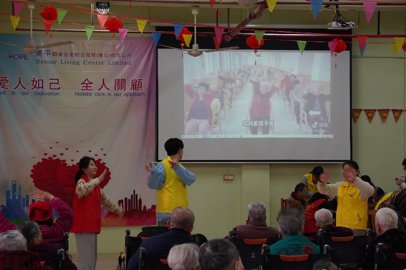 在手工活动期间,老师同学们带领着老人们一同跳手势操,老人们纷纷跟随动作活动起来,气氛温馨又活跃!
