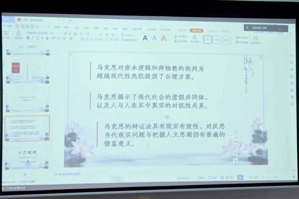 讲座最后,老师讲到马克思主义具有历史性的同时也具有时代性,在老师看来马克思给我们带来的最重要的时代性财富是:无时无刻地警醒我们应该去探索问题,不能习惯地屈身于劳动的剥削。我们要拿起马克思赋予我们的“武器”去揭露和批判;同时要去感悟团结的意义,领会温良的力量。只有我们共同努力,成为国家的建设者,才能够在现在和未来的时间里去继承中国五千年的文明,去继承马克思主义的思想,从而传承下去。