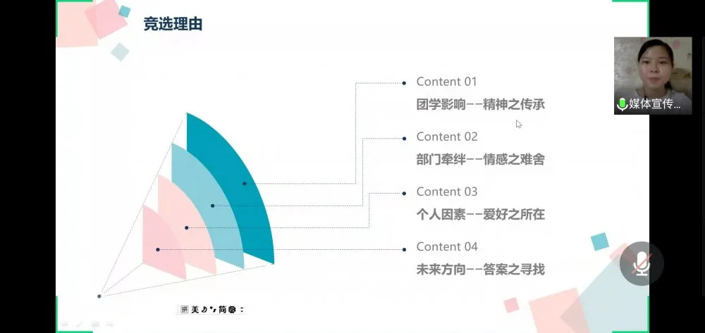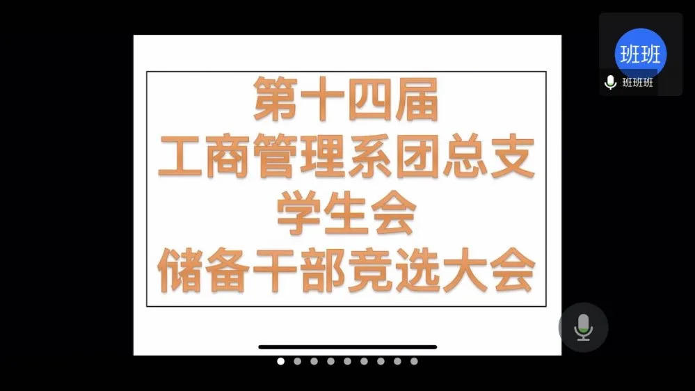 会议伊始,由办公室部长任少铧进行开幕致辞,简单介绍了本次竞选会议的流程及时间安排,总结在过去一年中部门工作的总体表现,并希望十四届的干部们能够稳稳握住接力棒,担起重任,在未来继续保持良好的工作态度,发扬团学,更好地为工商系服务。接着进入本次会议的重点演讲环节,各部门竞聘者根据要求对PPT内容进行演讲。部长们根据其演讲情况提出相应问题、做出假设考核各竞聘成员综合能力等考察。