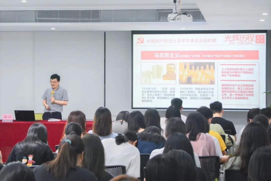 讲座开始,陈老师从三个阶段来分享《中共党史简明读本》一书,即新民主主义革命时期、社会主义革命和建设时期、改革开放和社会主义现代化建设时期,这三个历史时期的发展,始终贯穿着一条主线,那就是高举马克思主义的旗帜。关于中国共产党诞生的历史,陈老师着重讲述了新民主主义革命发生的背景新文化运动和五四爱国主义运动,这两场运动为中国共产党诞生奠定了充分的思想理论基础。