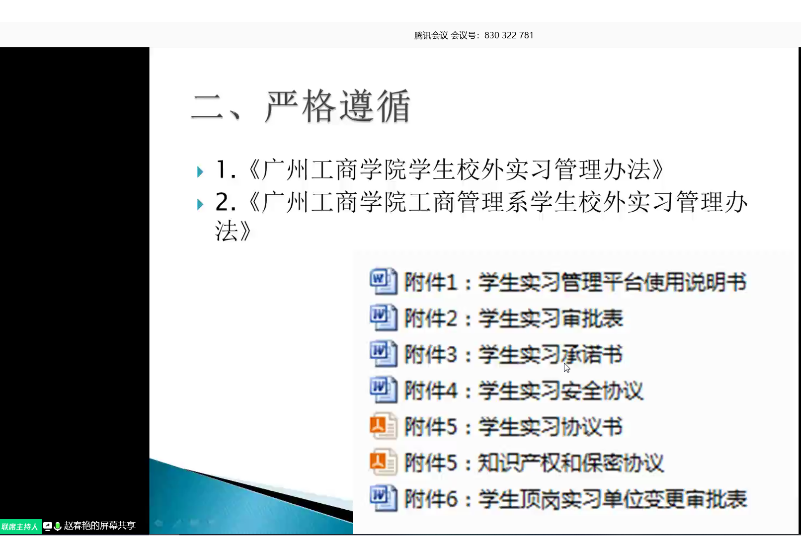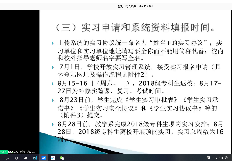 6月19日14:30,工商管理系通过腾讯会议方式,在线上召开2018级工商企业管理专业顶岗实习宣讲会,会议由2018级工商企业管理专业辅导员谭一酉主持。会议议程分为三项:一是工商管理系赵春艳副主任做动员讲话,二是各招聘企业进行线上宣讲,三是针对宣讲会内容进行答疑。