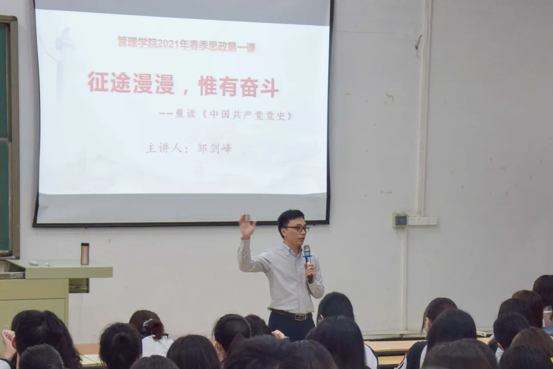 【本网讯】为深入贯彻落实习近平总书记在党史学习教育动员大会上的重要讲话精神,引导广大学生学史明理、学史增信、学史崇德、学史力行,在建党一百周年之际,我院于2021年4月21日19:00在二实C305举办了思政第一课活动讲座。本次讲座我们邀请到了管理学院副院长兼党总支书记邹剑峰同志为我们讲解《中国共产党党史》,由管理学院党总支青年委员余远远老师主持。