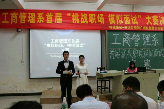 【本网讯】为了让同学们真切感受到求职面试的实况,做好职业规划以应对日益激烈的就业竞争,我系在5月18日下午2点30分于第一教学楼C102举行了首届“挑战职场,模拟面试”大赛总决赛,系主任石丽明教授,副主任赵春艳老师出席了本次活动。此次决赛特邀王光辉老师、张永权老师,越秀集团代表朱光阳先生、陈京水先生和邱骏先生,柏键集团经理黄博伟先生作为嘉宾评委。