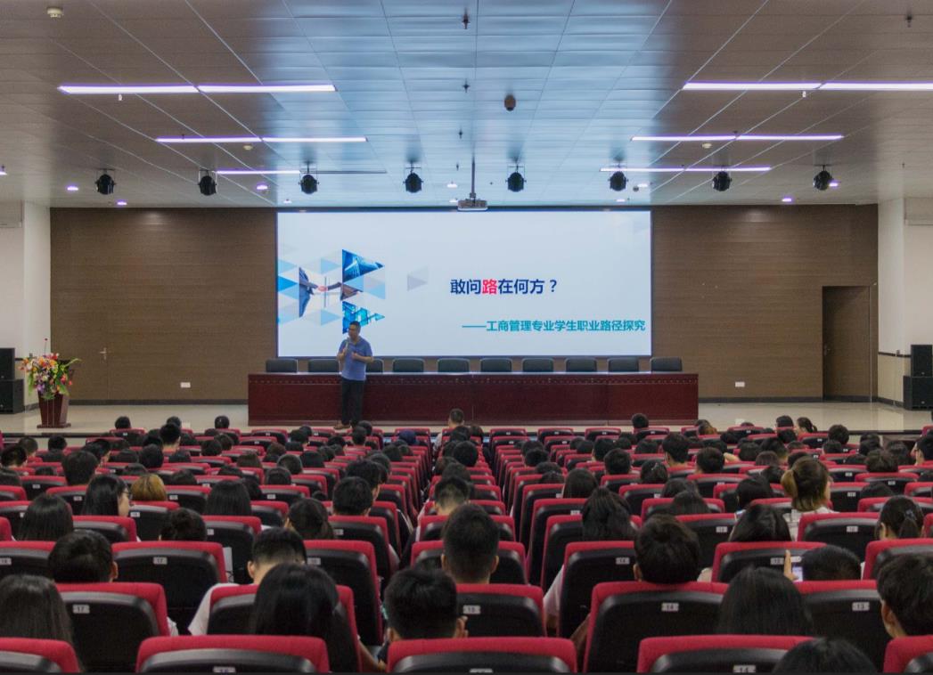 【本网讯】为进一步强化学生职业规划意识,拓展学生专业视野,增强学生专业自信心。5月2日晚,我系工商管理专业学生职业发展路径探究主题班会在三水校区学生活动中心6楼学术报告厅隆重举行。我系人力资源教研室江伟老师担任主讲。工商管理系副主任赵春艳老师、学工组组长王伟江老师和2015级8个本科班480名学生参加了班会。本次班会主题是《敢问路在何方---工商管理专业学生职业路劲探究》,江伟老师用我问你答、深度思考和厚积薄发三个环节与在场的学生热情互动。
