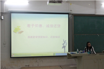 【本网讯】为进一步提高贷款学生对国家助学金贷款政策的正确认识,我系于2016年12月13日下午14:00在三水校区第一教学楼C102开展了以“君子怀德,诚信还贷”为主题的讲座。本次讲座由曾诗健老师主持召开,15和16级贷款的学生出席参加。