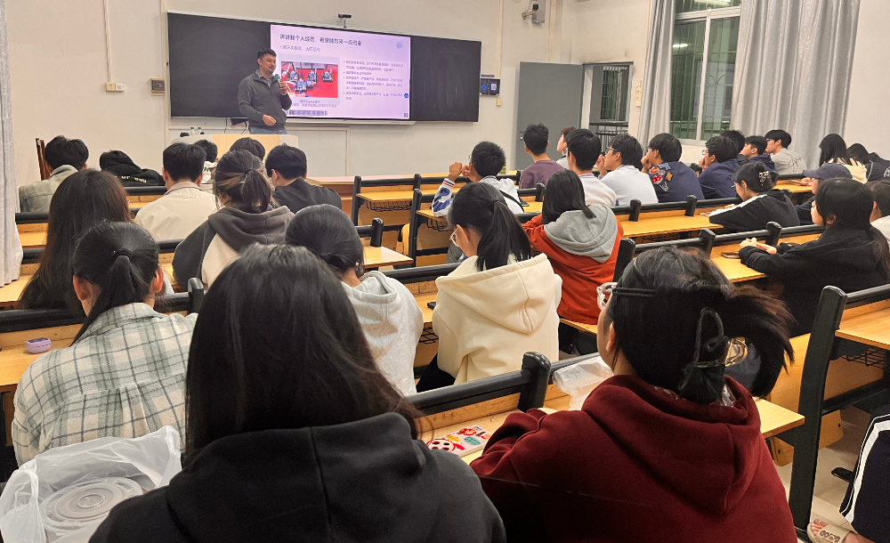 分享过程中,林山先生的话语直击学生痛点——针对现场大一和大二学生普遍存在的“职业规划迷茫”问题,他结合管理学科特点与社会需求,给出了极具针对性的建议。他表示,迷茫的核心在于“认知不足与实践缺位”,建议低年级学生从三方面提升综合能力,一是“夯实专业根基”,将管理学理论学深学透,建立系统化的知识框架;二是“主动探索新领域”,不必局限于本专业,可尝试接触AI、大数据等与管理结合紧密的新兴领域,了解行业发展趋势;三是“强化适应与学习能力”,通过实习、校园实践等机会积累经验,学会在变化中快速调整,“社会需求始终在变,只有保持学习的主动性,才能跟上节奏”。朴实的建议、鲜活的案例引发全场共鸣,同学们纷纷点头认可,不少人拿起笔记录下关键要点。