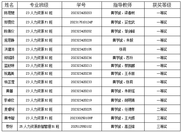 优异成绩的背后,是“德学五进”育人理念的深度浸润与指导教师团队的匠心培育。核心指导教师黄学斌携手12位教师组建辅导团队,紧扣赛事要求与“五进”路径:引导学生“进课室”深耕专业理论、“进图书馆”研习行业前沿动态,赛前筑牢知识根基;组织学生“进实验实训室”逐一审改作品、反复打磨呈现细节,“进社会”联络企业HRD与行业学长开展真实访谈,锤炼实践应用能力;以“进体育场馆”培育的坚韧意志与团队精神,激励学生攻克备赛难关。多名指导教师均获“优秀指导教师奖”,黄学斌老师更在教师组“园丁情”创课大赛中,以作品《组织行为学》斩获全国二等奖,实现师生同频获奖、教学相长的良好局面(教师获奖详情见下表)。