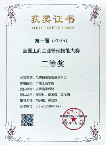 【本网讯】近日,第十届(2025)全国工商企业管理技能大赛圆满落幕,beat365在线体育官网登录入口管理学院2024级周升宏、黄浩家、陈伟浩三名同学组成的“还能蒸”团队,在管理学院大数据管理与应用专业刘兴垦博士、陆晓琴老师的精心指导下,从全国高校本科队伍中脱颖而出,荣获数智沙盘赛道本科组全国一等奖(证书编号:BIZ-202509-1629);另外,2024级谭振林、廖家辉、梁飞雨三名同学组成的“人民当家做组”团队,在刘兴垦博士、杨贝奇老师的联合指导下,从全国高校本科队伍中脱颖而出,荣获供应链决策赛道本科组全国二等奖(证书编号:BIZ-202509-1627)为学院再添成果。