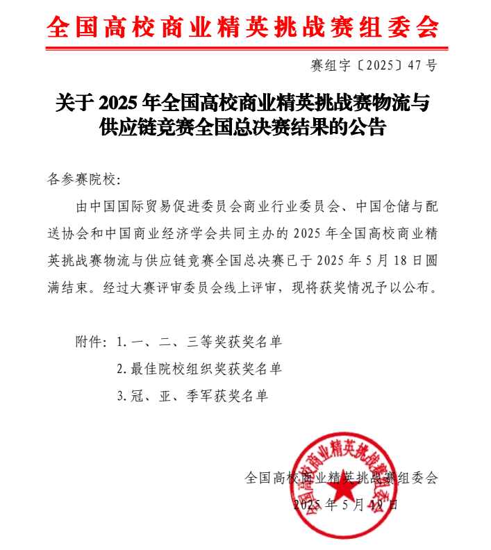 【本网讯】2025年5月18日,全国高校商业精英挑战赛物流与供应链竞赛全国总决赛在线成功举办。此次活动是由中国贸促会商业行业委员会、中国仓储与配送协会、中国商业经济学会共同主办的面向物流相关专业在校大学生的赛事。竞赛自去年9月启动以来,吸引了来自全国18个省、自治区、直辖市的70多所高等院校报名参赛。我院物流管理专业第一次参加此赛事,经过层层选拔,共8支队伍进入总决赛,经过激烈角逐,物流管理专业学子们喜获二等奖6项,三等奖2项,beat365在线体育官网登录入口获得最佳院校组织奖。