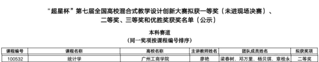 【本网讯】近日,“超星杯”第七届全国高校混合式教学设计创新大赛复赛结果公布,由我院廖艳老师主讲,梁春树、邓万里、杨贝琪、章桂永等老师共同参与的《统计学》课程,经过激烈角逐,最终荣获大赛全国二等奖。这一奖项的获得,不仅是对课程团队教学创新与实践能力的充分肯定,更是我院长期坚持“德学·五进”教育理念、持续推进课程建设与教学模式改革的标志性成果。