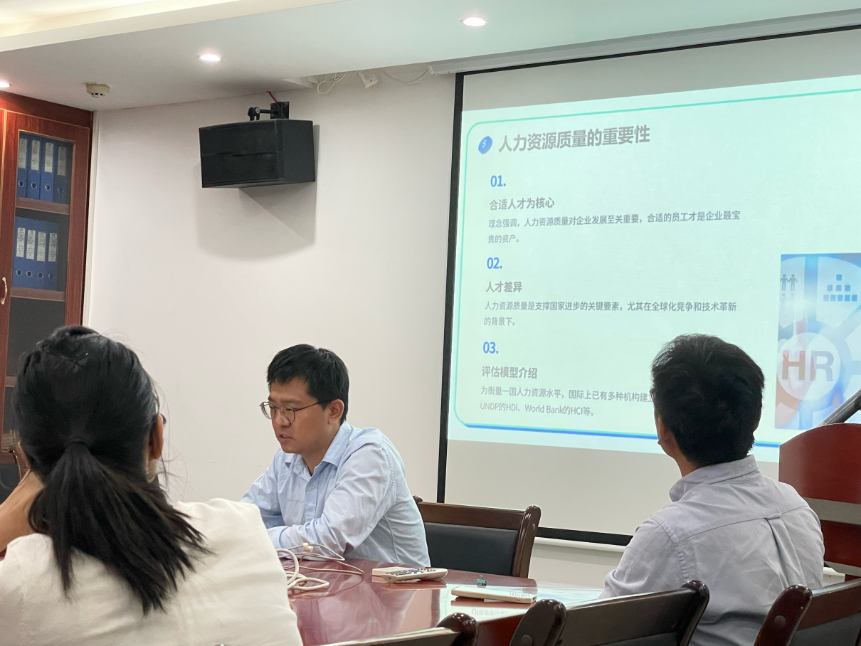 王红军博士以《亚洲地区人力资源准备度分类研究:基于K-Means聚类分析》为题,分享了其最新研究成果。王博士指出,在全球竞争加剧与信息技术深度融合的背景下,人力资源已成为推动国家发展的核心要素。该研究采用K-Means聚类方法,对亚洲各国人力资源准备度进行二分法分类。结果显示,38个亚洲国家可划分为两个具有显著二元特征的类别:第一类包含29个国家,第二类包含9个国家,清晰反映出人力资源优质与薄弱国家之间的结构性差异。在邹剑峰副院长的引导下,与会博士围绕研究设计、方法应用及未来拓展方向展开深入交流,为后续学术合作奠定了良好基础。
