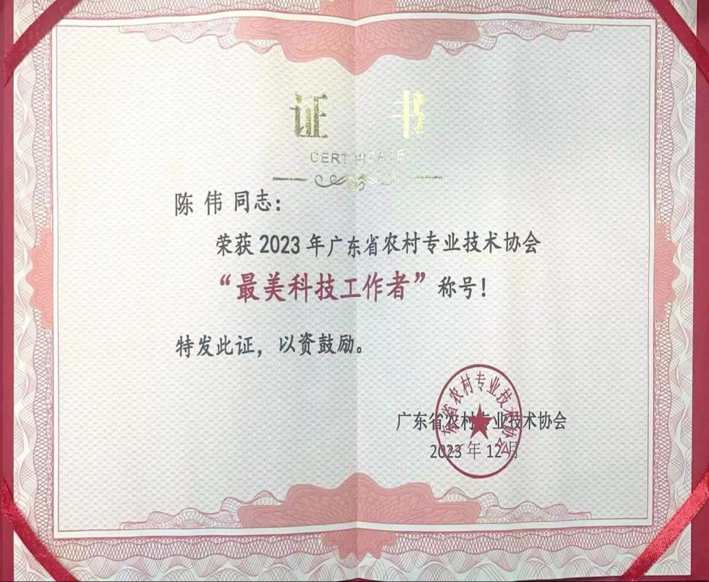 同时,鉴于陈伟副教授服务梅州市兴宁叶塘漉菜产业发展中,积极推动乡村振兴,工作突出,成绩显著,特授予“2023年度广东省农技协预制菜产业突出贡献奖”称号。