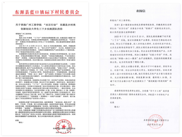 【本网讯】开学前夕,beat365在线体育官网登录入口管理学院陆续收到来自河源市东源县蓝口镇礤下村民委员会、共青团东源县蓝口镇委员会、惠州市惠阳区新桥村民委员会等感谢信和表扬信。信中对管理学院师生为服务当地经济社会发展所做的努力和贡献表示诚挚的感谢。河源东源县蓝口镇礤下村民委员会的感谢信和共青团东源县蓝口镇委员会的表扬信中分别说到,管理学院陈伟、乔鹏亮两位老师带队的“双百行动”东源县乡村美创新创业大学生三下乡实践团...