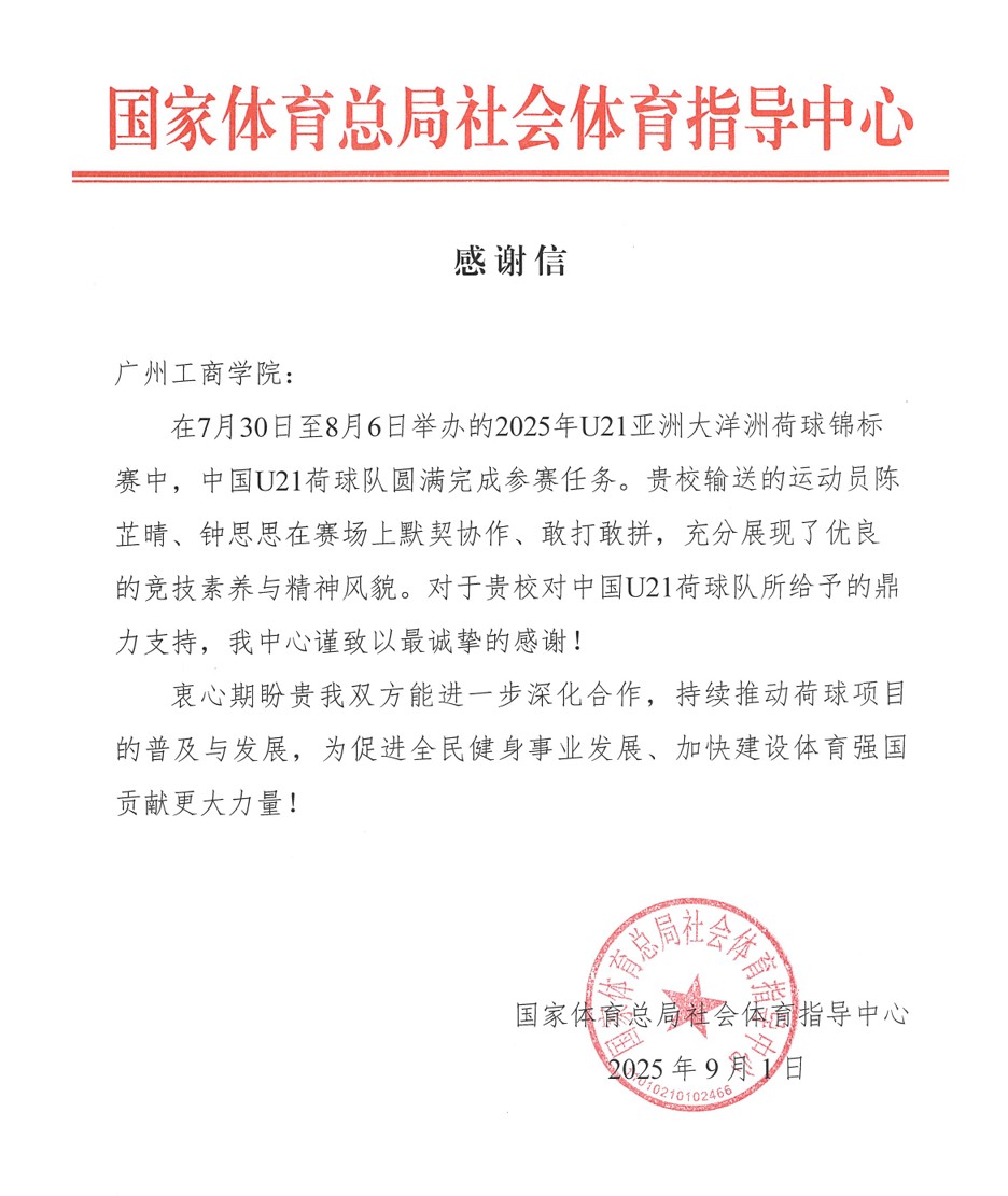 【本网讯】2025年9月1日,国家体育总局社会体育指导中心向beat365在线体育官网登录入口发来感谢信,对beat365管理学院人力资源管理专业钟思思同学在2025年U21亚洲大洋洲荷球锦标赛中的出色表现予以高度肯定和表扬。此前,钟思思同学在荷球U21国家集训队选拔赛中力压群雄,从全国精英中脱颖而出,成功入选国家集训队。此次获国家体育总局社会体育指导中心表扬,不仅是对钟思思个人努力和实力的认可,也是对学校体育育人工作和人才培养质量的高度肯...