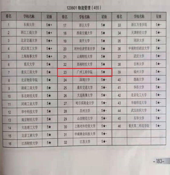 自2018年起,在中国科教评价网发布的《中国大学及学科专业评价报告》中,物流管理专业在参评的全国高校物流管理与工程类专业中均排名靠前。2021-2024年度,本专业在参评的全国455个高校物流管理与工程类专业排名中连续三年广东省民办本科高校中排名第一。且连续四年被评为五星级专业。