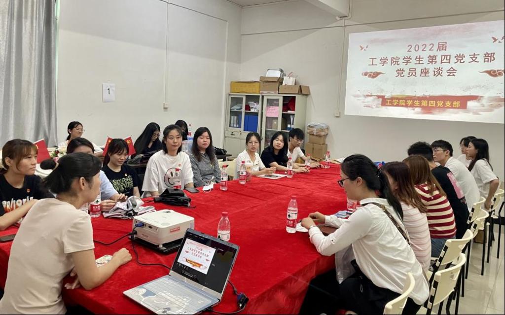 【本网讯】为进一步加强对毕业生党员的教育,勉励党员同志勇担使命,时刻不忘党员身份,工学院学生第四党支部于2022年6月9日在教学楼召开毕业生党员座谈会。参加本次座谈会的有工学院学生第四党支部书记胡伟芳同志以及2018级毕业生学生党员、预备党员。此次会议由工学院学生第四党支部书记胡伟芳同志主持。