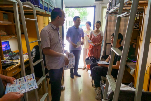 之后,罗俊同志与参会同志走进学生宿舍,向学生介绍诈骗的常见手段、电信诈骗案件情况及主要表现形式,并结合具体案例,讲解了防范电信诈骗的有效措施,以此加强同学们防范意识,学会辨认真假,识破骗局。