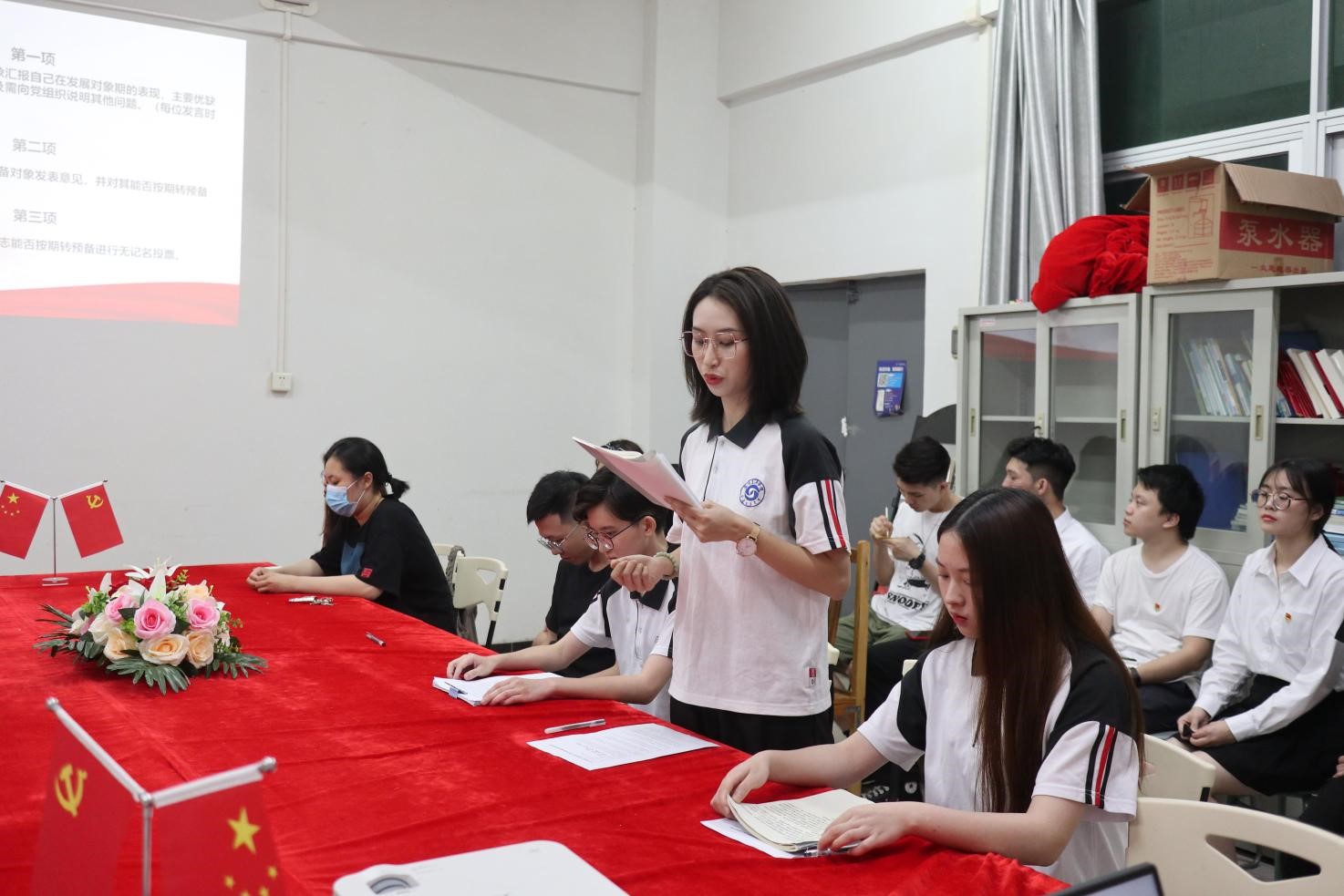 郭婷婷同志向出席同志介绍吸收预备党员通表大会的具体流程。全体起立,奏唱国歌。