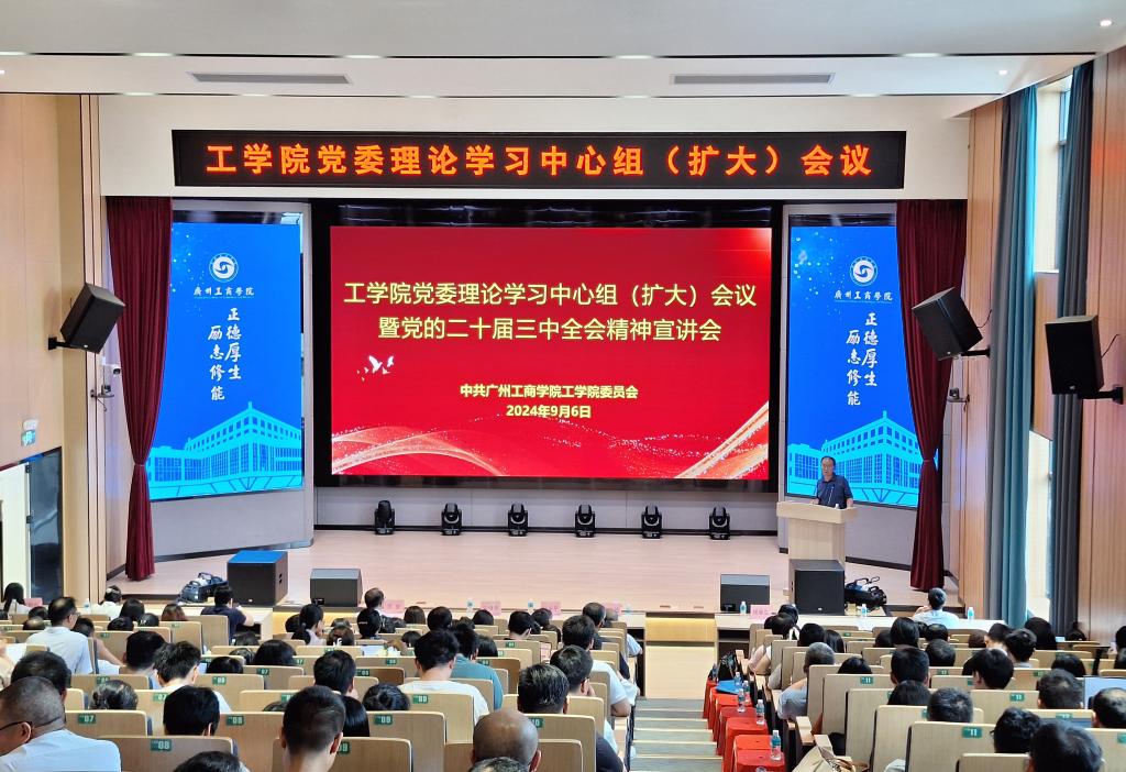 【本网讯】9月6日,工学院在第三综合楼707礼堂召开党委理论学习中心组(扩大)会议暨党的二十届三中全会精神宣讲会。学院党政领导班子成员、基层党支部书记、学院师生共300余人参加。会议由党委副书记罗俊主持,党委书记宋锋华主讲。
