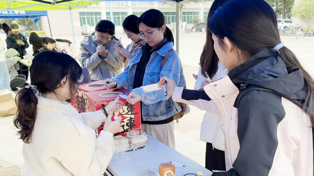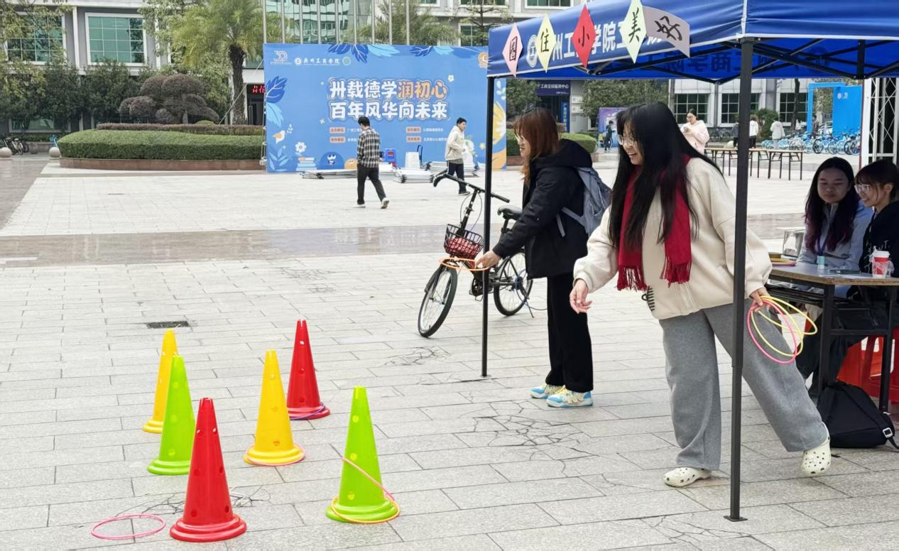 紧接着是趣味疗愈板块,三项活动接力解压,“图你一乐谐战”以谐音梗图片猜词互动为核心,单人答对4题或双人组队答对7题即可通关,轻松幽默的氛围有效消解焦虑情绪;“绳上滑球”需两人协作抖动双绳,传接球入杯,在两次挑战机会中增进彼此默契;“圈住小美好”环节中,每人拥有5个套圈,套中3个即通关,未通关可通过常识问答补投。丰富的趣味体验既舒缓了身心疲惫,同时也有效缓解了期末压力与季节交替带来的情绪困扰。