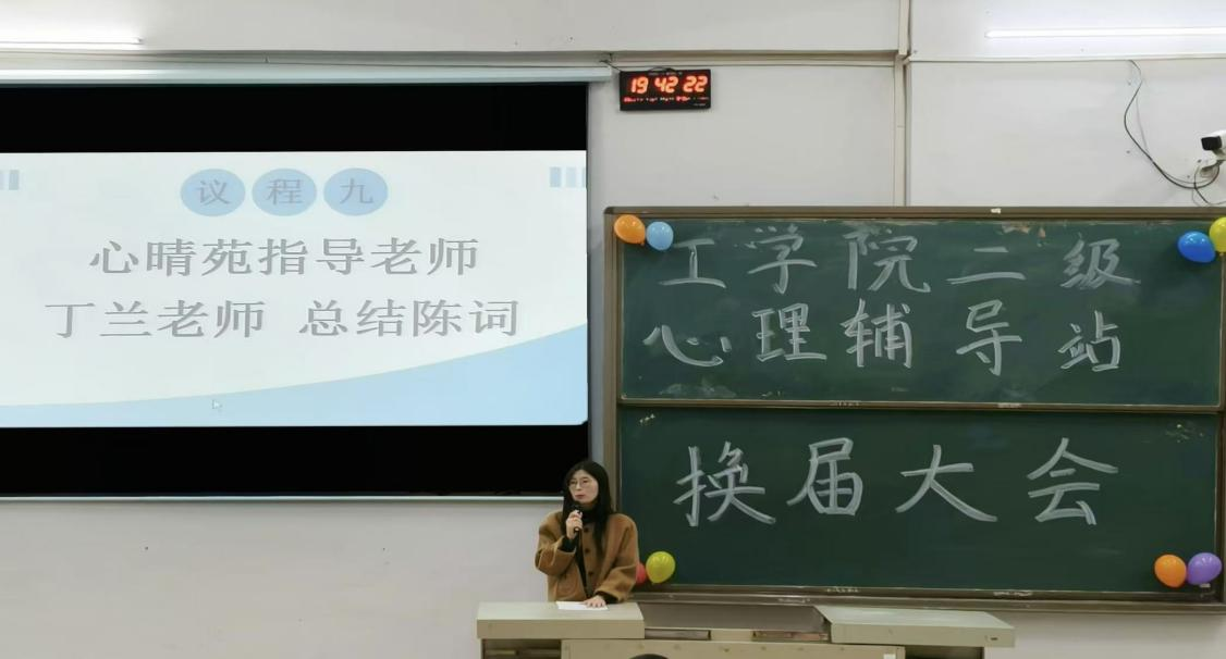 最后,指导老师丁兰为本次大会作总结。老师对老一届成员的付出给予了高度评价,同时对新一届成员表示热烈祝贺,并提出了新的期望与要求:希望新一届团队能坚守初心,勇于创新,将心晴苑这个大家庭发扬光大,共同书写更加灿烂的篇章。