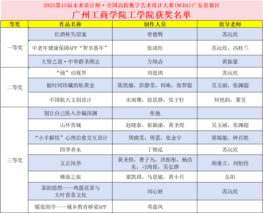 【本网讯】8月8日,第13届未来设计师·全国高校数字艺术设计大赛(NCDA)公布的广东赛区获奖名单中,工学院学子凭借扎实的专业功底和卓越的创新能力,从全省众多参赛院校队伍中脱颖而出,喜获省级一等奖3项、二等奖3项、三等奖8项,共计14项大奖!