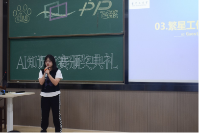 接下来是由繁星工作室-百度飞桨领航团团长实习生发言,她总结了本次AI知识竞赛获得成功离不开各方的帮助与支持,感谢了本次参加比赛的同学,是他们的智慧给了本次比赛无限可能,对本次AI知识竞赛给予帮助的老师及工作人员表示感谢。她表示本次AI知识竞赛涵盖图像处理等领域,为参赛同学提供一个了解AI知识的平台,并对本次获奖的同学表示祝贺,希望他们继续努力,将来有对AI方面的想法都能够实现。