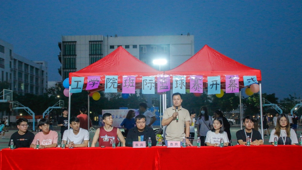 【本网讯】为增强工学院学生身体素质,提高同学团体凝聚力,我院在18、19、20级同学间举办了班际篮球赛,开幕式于2021年4月12日下午19:00在篮球场8号场举行。出席本次开幕式的嘉宾有我院学工办主任钟伟,团委学生会指导老师张渊超,辅导员张娥、李棒棒、潘杨,团委副书记林俊彬,学生会主席张东升、罗海翔、宋紫萌。