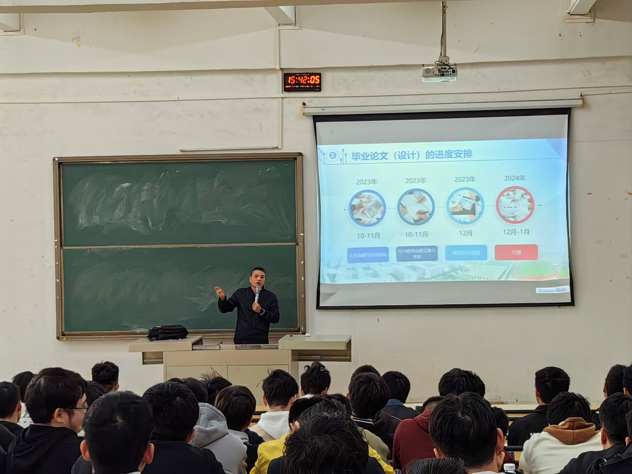 该会议由钟百胜老师主讲,首先对所有参会的学生表示了鼓励和支持,他表示:“毕业设计是你们大学生活中不可或缺的重要环节,它既是对你们学术旅程的一个总结,也是你们进入职业生涯的一个关键跳板。因此,我希望你们能认真对待这次机会,努力为自己的毕业设计选择一个合适的主题。”