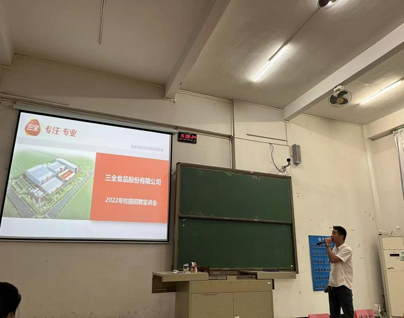 三全食品股份有限公司的李新经理先是从发展历史、行业地位、社会责任等方面介绍了三全食品有限公司,最后介绍了入职三全后的职业发展路径,培养计划等。
