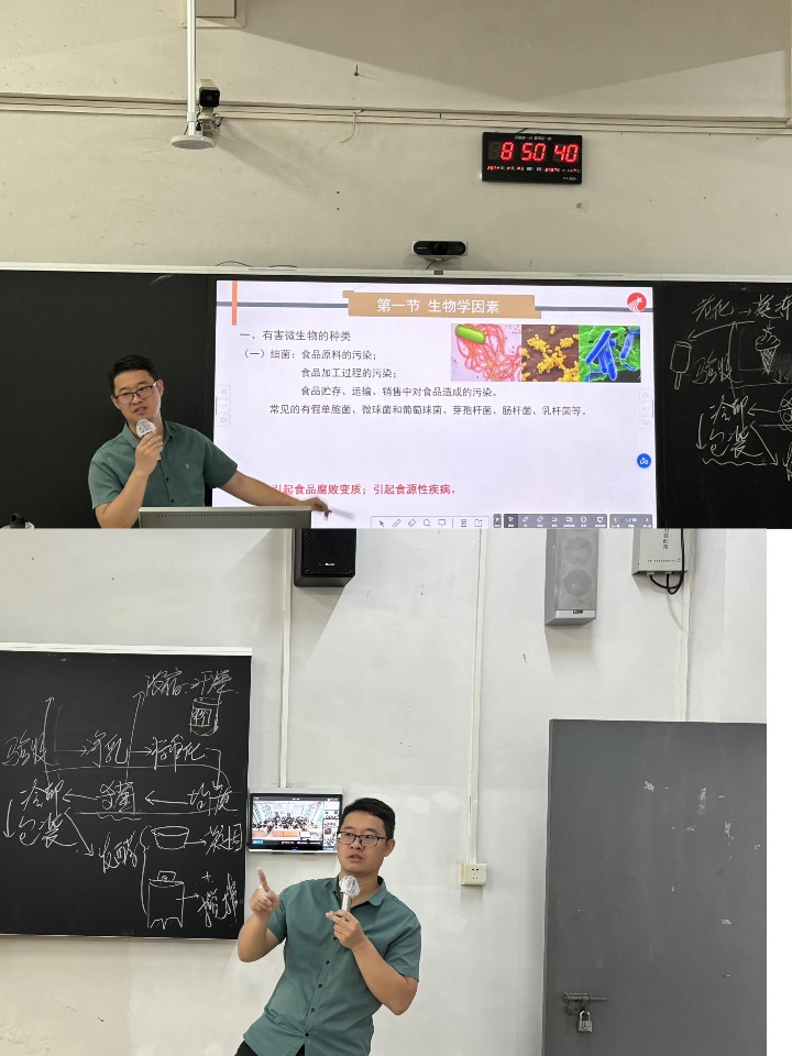 授课过程中,钱镭博士先用简洁清晰的PPT课件带学生一起回顾了上节课所讲到的消毒乳相关内容,随后以315热点食品安全案例引入第五章食品安全与质量控制相关内容,从生物学因素、化学因素、食物中的天然毒素以及食品添加剂四个方面剖析食品安全与质量控制,条理清晰,课堂氛围活跃,取得了很好的教学示范效果。