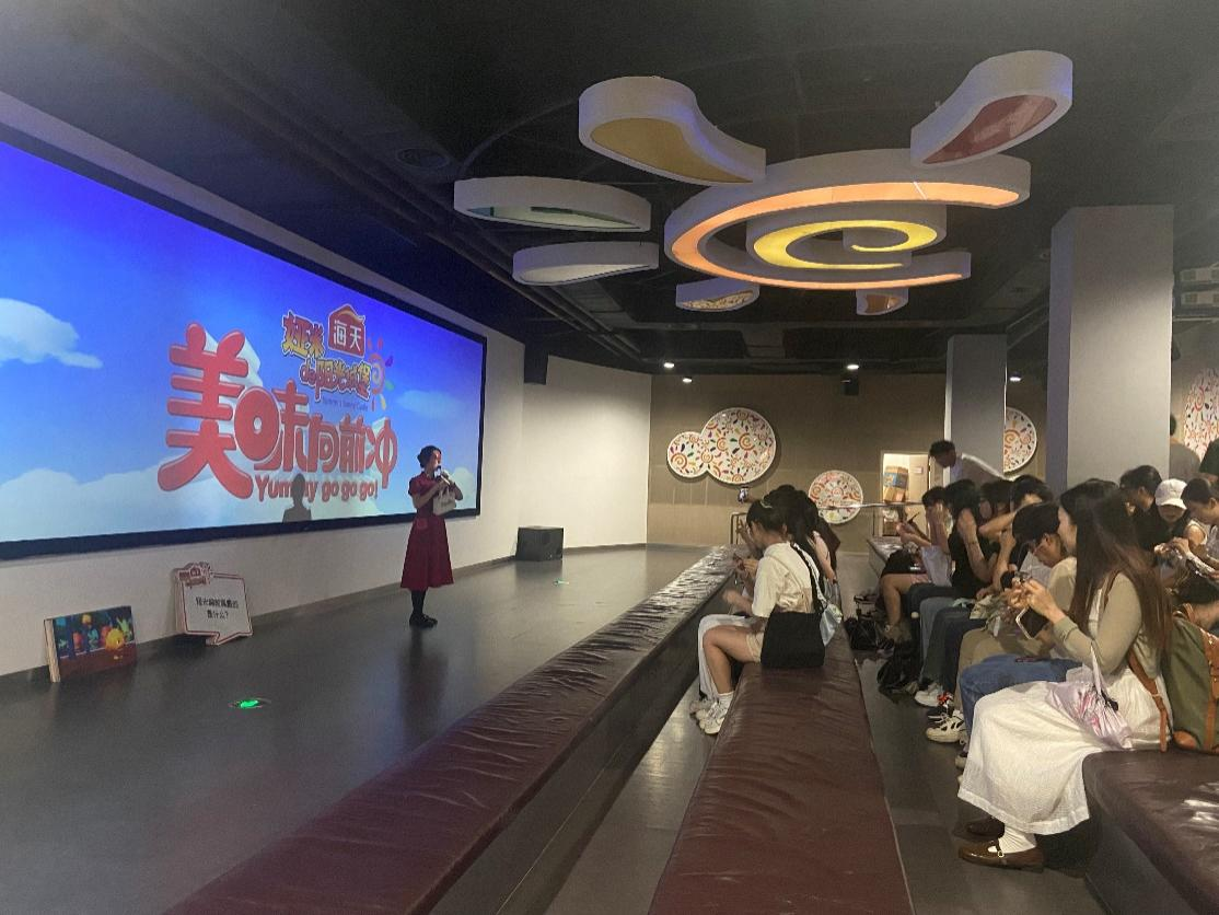 然后,海天讲解员把同学们分批带进“酱园古风”,给同学们讲解了海天品牌的由来、产品的优势和产品类型,其中有一条呈现古代酱油酿造过程的通道,在这条通道上同学们能够全程看到古代酱油生产的整个过程-从黄豆、到成品、再到杂货店出售的过程,深入了解古时酱油工艺的制作。同时,同学们观看了海天酱油的宣传片,让同学们对海天产品有了进一步的认识。随后,在讲解员的带领下,通过3D影院、4D绘画等让同学们了解了酱油酿造的发展史及产品类型。在工厂走廊,同学们透过玻璃窗,看到了酱油生产的实时生产场景,对酱油的生产到包装成品及样品检测一览无余。同学们对每小时可产52000瓶的自动化生产线和储存3.5万吨酱油的无人仓库-海天酱油的全自动化生产技术赞叹不已。紧接着,在讲解员的带领下,同学们参观了厂区内规模最大的阳光天然晒池、发酵大罐,完成了长达3公里空中走廊的行走,近距离体验海天味业的宏伟景观。参观后,同学们品尝了海天的最新产品-苹果味饮料、冰淇淋和麻薯等,同学们都赞不绝口,了解了海天的高科技技术。
