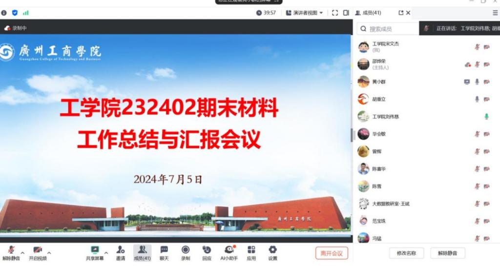 【本网讯】为全面总结工学院本学期期末材料归档工作成效,进一步推动下一学年各项教学工作的规范开展,工学院于2024年7月5日组织召开期末材料第二阶段工作总结与汇报会议。会议由工学院胡垂立副院长主持,全体教研室正副主任、教务员参加。
