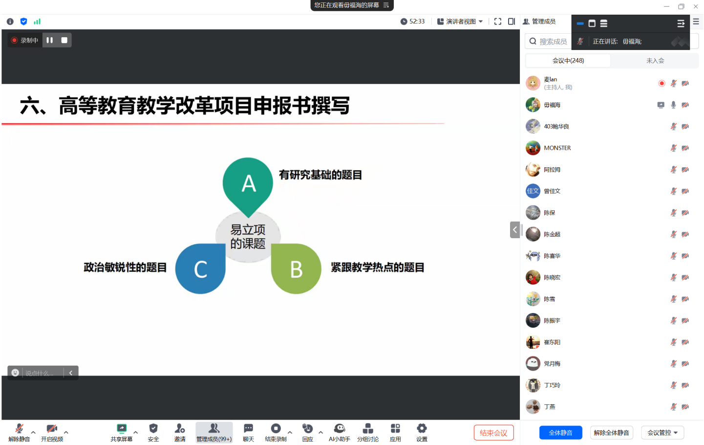 【本网讯】为了推动高等教育教学改革,提升项目申报质量,工学院8月2日举办以“高等教育教学改革项目申报”为主题的专题讲座,工学院全体专任教师参加。本次讲座旨在通过线上平台,汇聚教育领域的专家智慧,为广大教师提供及时、精准的申报指导,助力高等教育事业的蓬勃发展。