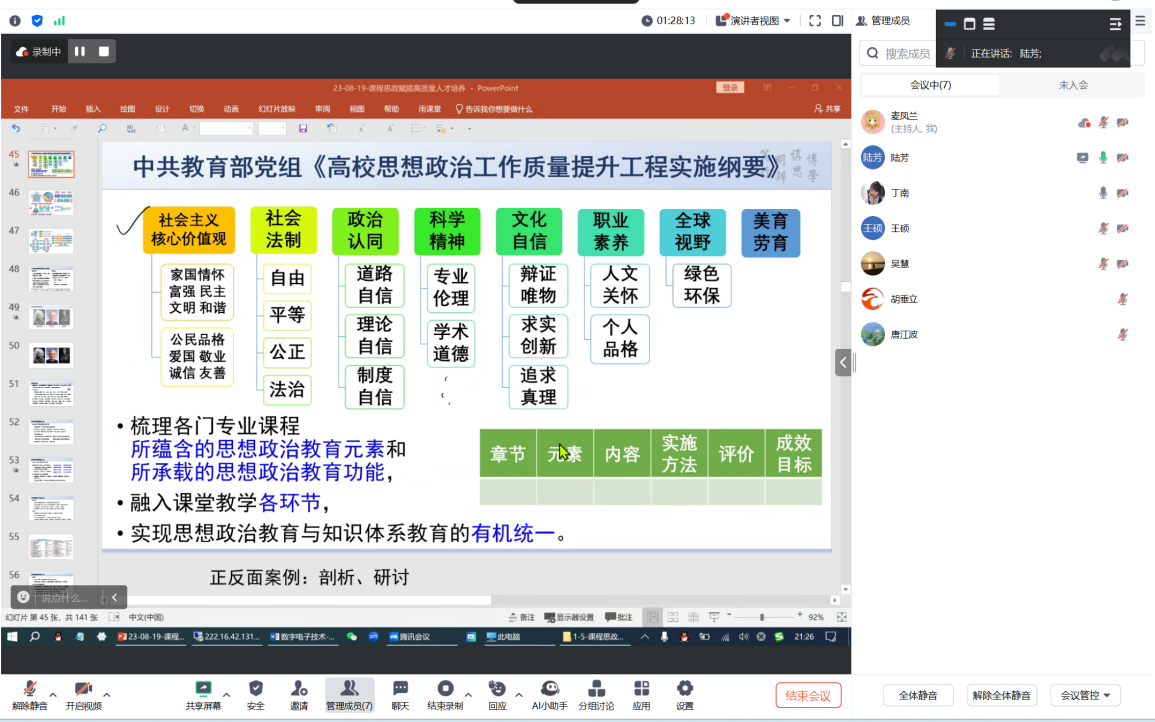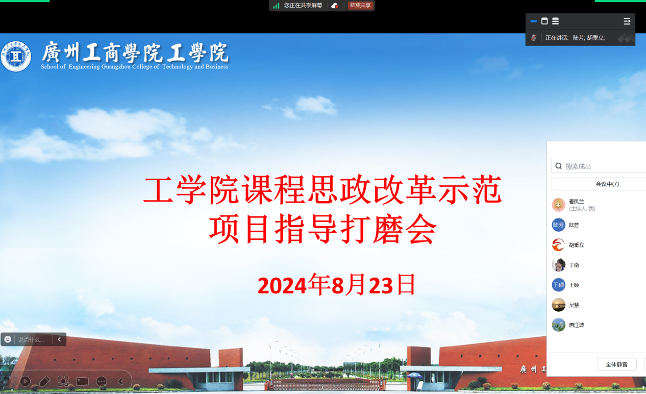 【本网讯】2024年8月23日晚上,工学院召开了课程思政示范项目线上指导打磨会,旨在进一步提升学院课程思政建设的质量与成效,为近期申报省级课程思政示范项目做准备。