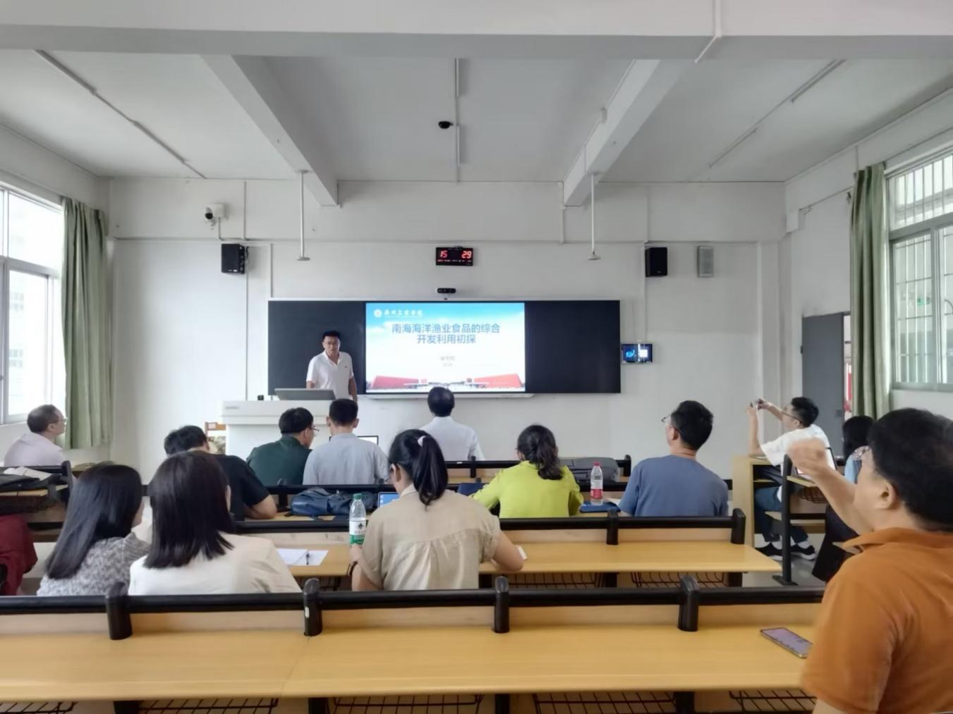 第二位汇报老师为崔东阳博士。崔老师于中国海洋大学获得博士学位,专业方向为海洋食品与营养研究。崔博士汇报的题目为《南海海洋渔业食品的综合开发利用初探》。崔博士首先简要介绍了博士阶段的研究方向和内容,并结合工学院食品专业的特点和平台建设,重点汇报了食品+海洋的课题研究方向设想。