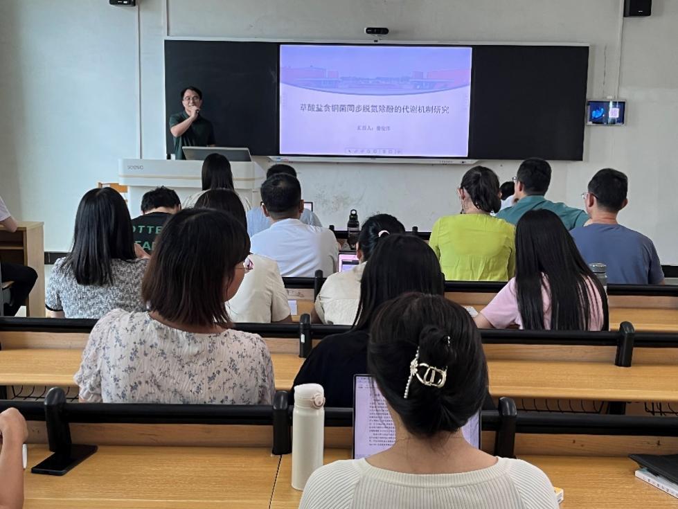 第一位汇报人是晏俊伟博士,毕业于华南理工大学,专业研究方向为菌种的选育、遗传改造和代谢机制研究。他此次的汇报题目为《草酸盐贪铜菌同步脱氮除酚的代谢机制研究》。晏博士通过基因组蛋白组多组学分析揭示了一种草酸盐贪铜菌的代谢途径与苯酚的耐受性机制,利用分子生物学方法构建突变株与大肠杆菌异源表达菌,阐明了草酸盐贪铜菌苯酚降解基因的转录调控机制,解析了该草酸盐贪铜菌同步脱氮降解苯酚的代谢机制。