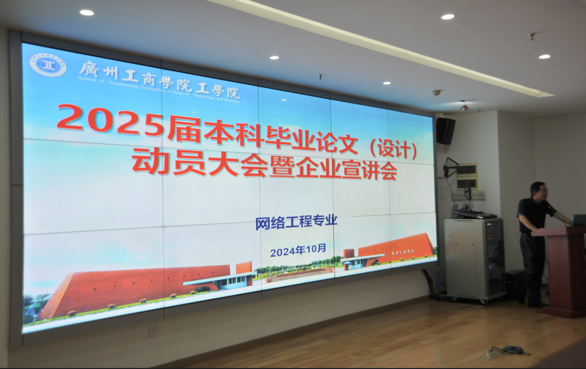 【本网讯】在这金秋十月,天高云淡,硕果累累的美好季节里,为了让2025届网络工程学生深入了解毕业设计整体流程、毕设规章制度、时间安排、选题、开题、中期检查、答辩等一系列毕设相关工作流程和任务。工学院网络工程专业于2024年10月22日晚上7点在院部楼525开展了2025届网络工程本科毕业设计动员大会暨企业宣讲会。