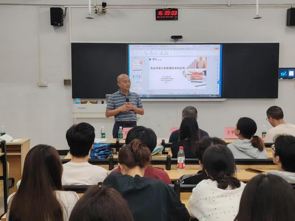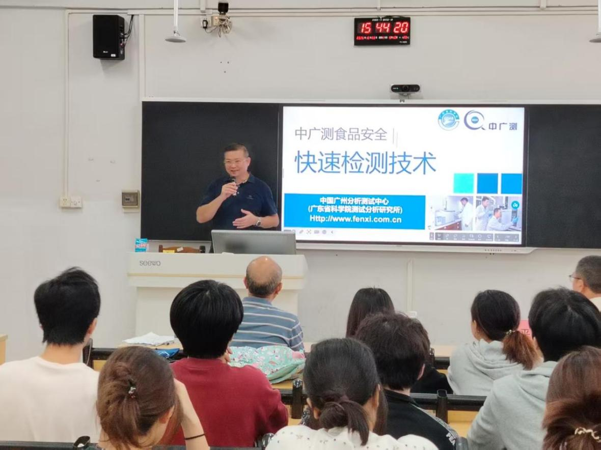 在随后的主讲环节,张冠文研究员从宏观层面系统梳理了当前食品安全快速检测技术的发展脉络、国家政策导向及市场需求。他结合丰富的行业案例,生动阐释了快速检测技术在应对突发性食品安全事件、进行日常市场监督抽检中的关键作用,让同学们对技术背后的社会价值与产业意义有了更深刻的理解。