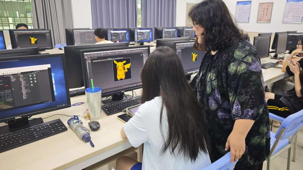 刘怡伶老师带来的《三维卡通角色建模基础之皮卡丘模型》课程,则聚焦于三维角色建模这一关键技术环节。皮卡丘作为广受喜爱的经典卡通形象,其建模过程充满了挑战与趣味。因为23级数字创意实验班学生之前有上过三维基础课程,学生学习过3ds Max软件,刘老师帮学生们复习了之前学习的相关内容,从该软件的基本操作入手,引导同学们搭建起角色的大致框架,逐步细化身体各部位的形状。在讲解耳朵的建模时,刘老师不仅展示了如何精准地塑造其轮廓,还深入分析了如何通过调整参数使其更符合皮卡丘的标志性特征。对于皮卡丘身上的纹理,如脸颊的红晕、尾巴的形状等,刘老师更是细致入微地教导同学们运用纹理绘制工具进行刻画,使同学们深刻体会到三维建模中细节雕琢的重要性。通过这一课程,同学们掌握了角色建模从宏观到微观的完整流程,为后续在数字角色设计领域深入探索筑牢根基。