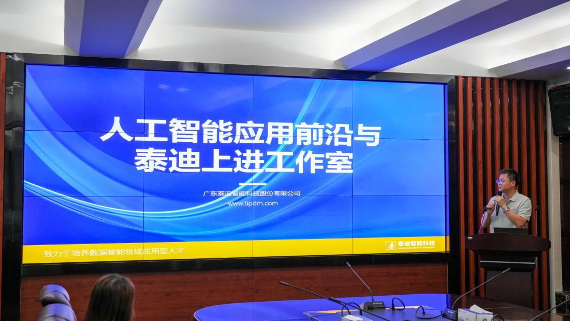 揭牌仪式后,张良均董事长作题为《人工智能应用前沿与泰迪上进工作室》的专题报告,深入剖析了数据素养在新时代背景下的重要价值,结合典型行业案例,分享了数字化转型趋势下的人才能力需求及实践路径,为学院专业建设与课程改革提供了有益启示。