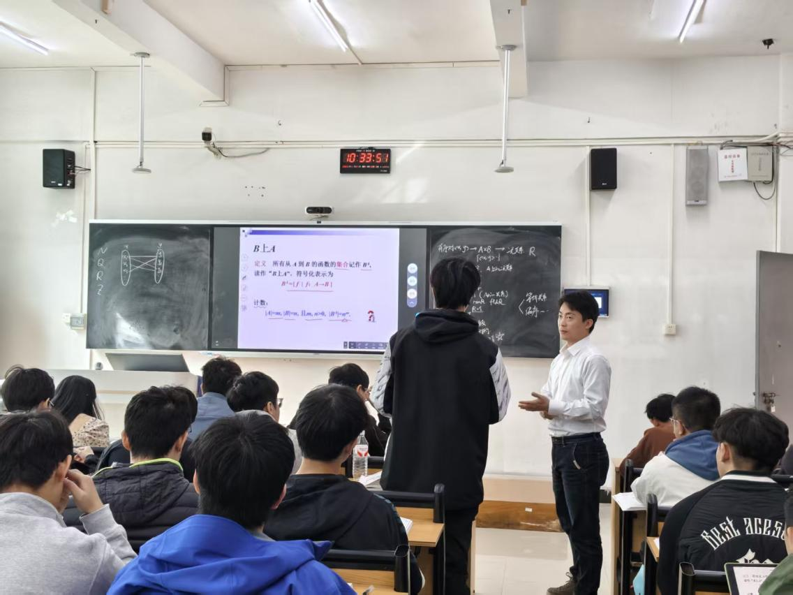 王晓明老师讲授《离散数学》课程,围绕“函数的定义、复合与反函数”展开系统讲解。王老师教学准备充分,板书工整,在讲解“函数”概念时,自然融入中国数学家李善兰翻译“函数”一词的历史故事,引导学生理解“我们站在前人肩膀上”的学术传承精神,实现知识传授与价值引领的有机结合。授课过程语音语速适中,讲课方式贴合本校学生学情,通过及时提问、随堂练习、学生互动回答等方式,增强课堂的参与感与实效性,体现出较强教学亲和力。