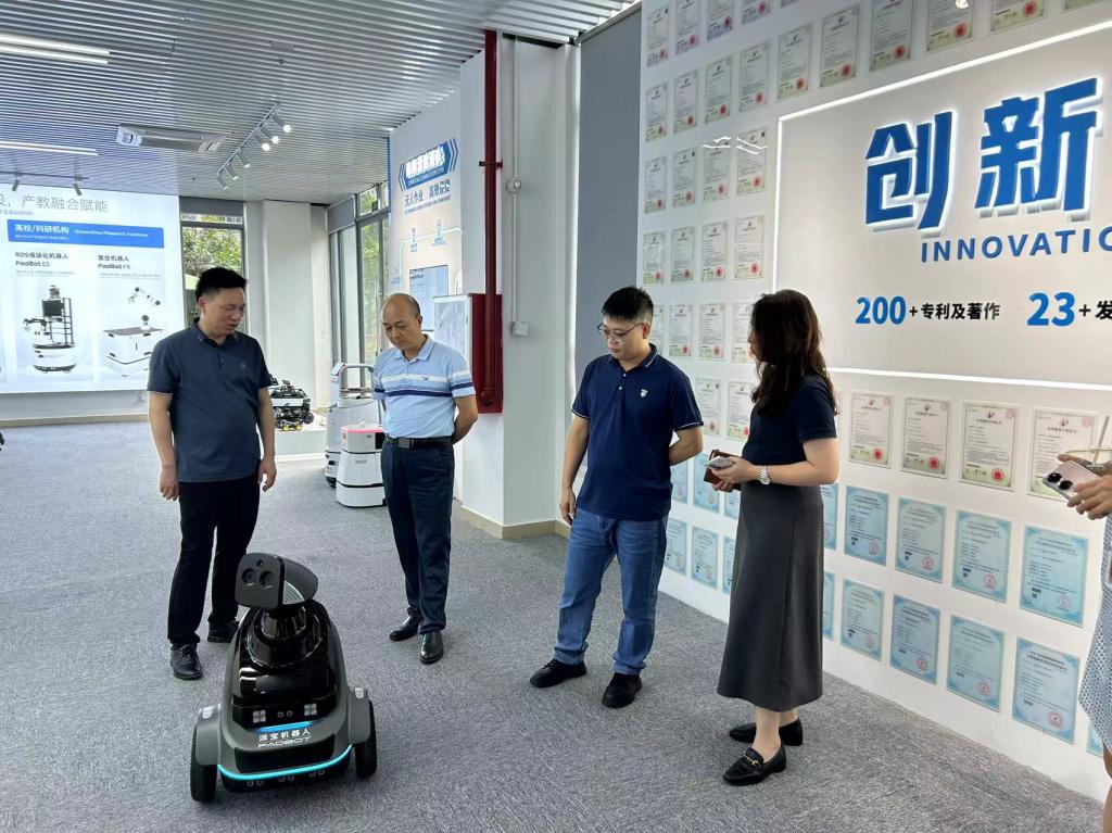 在派宝机器人公司相关负责人的陪同下,参观派宝机器人的展厅。展厅内陈列着各式机器人产品,展示派宝机器人在人工智能领域的研发成果,学院领导对派宝的技术实力和创新精神表示高度赞赏。