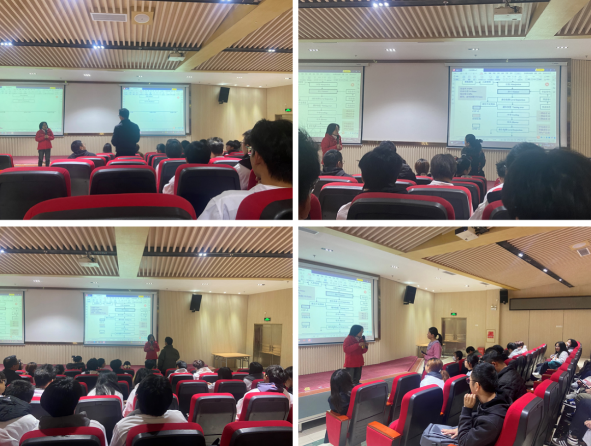 车间参观结束后,红牛企业特意安排了“模仿话术”环节,邀请企业品管部曾慧老师,通过模拟行业对话的形式,分享了红牛品牌的发展历程、生产状况、创新理念、管理体系以及公司文化,尤其围绕红牛产品的生产工艺流程,以红牛产品为例详细讲解了生产产品的各个环节,强调了产品品质检测管理环节的重要性。同时,曾老师强调创新是食品行业的灵魂,正如红牛始终致力于研发更符合消费者需求的能量产品,鼓励学生要敢于梦想,勇于创新,用实践检验知识,用创新引领未来。这些来自行业前沿的声音,不仅传递了食品行业的最新动态,更激发了学生们对食品科学的浓厚兴趣与无限遐想。